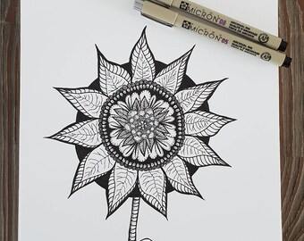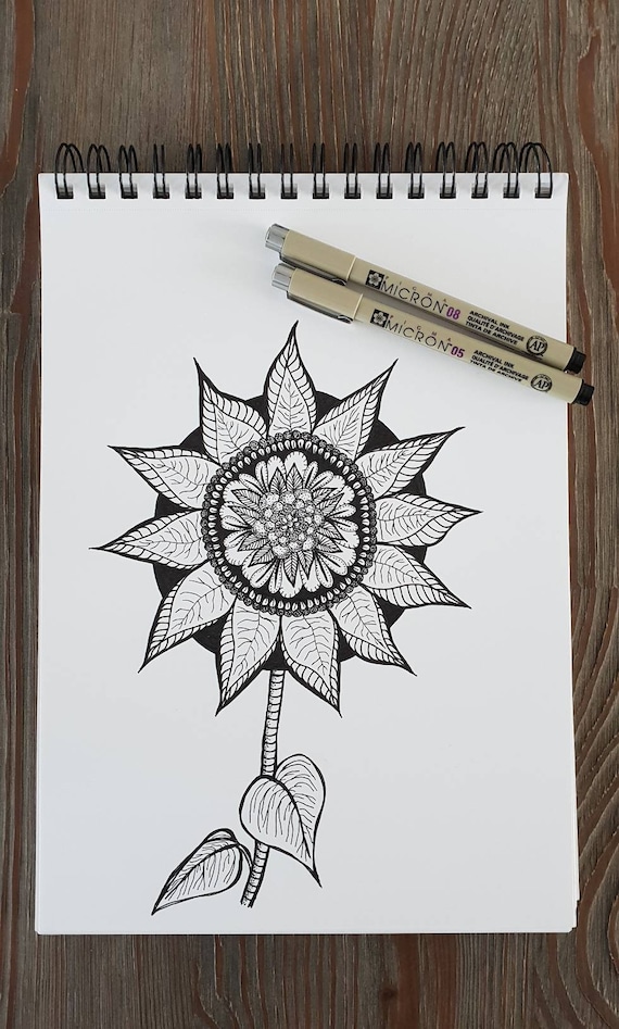 Zentangle Drawing Handmade With Pen On Artist Paper Sunflower Nature Drawing